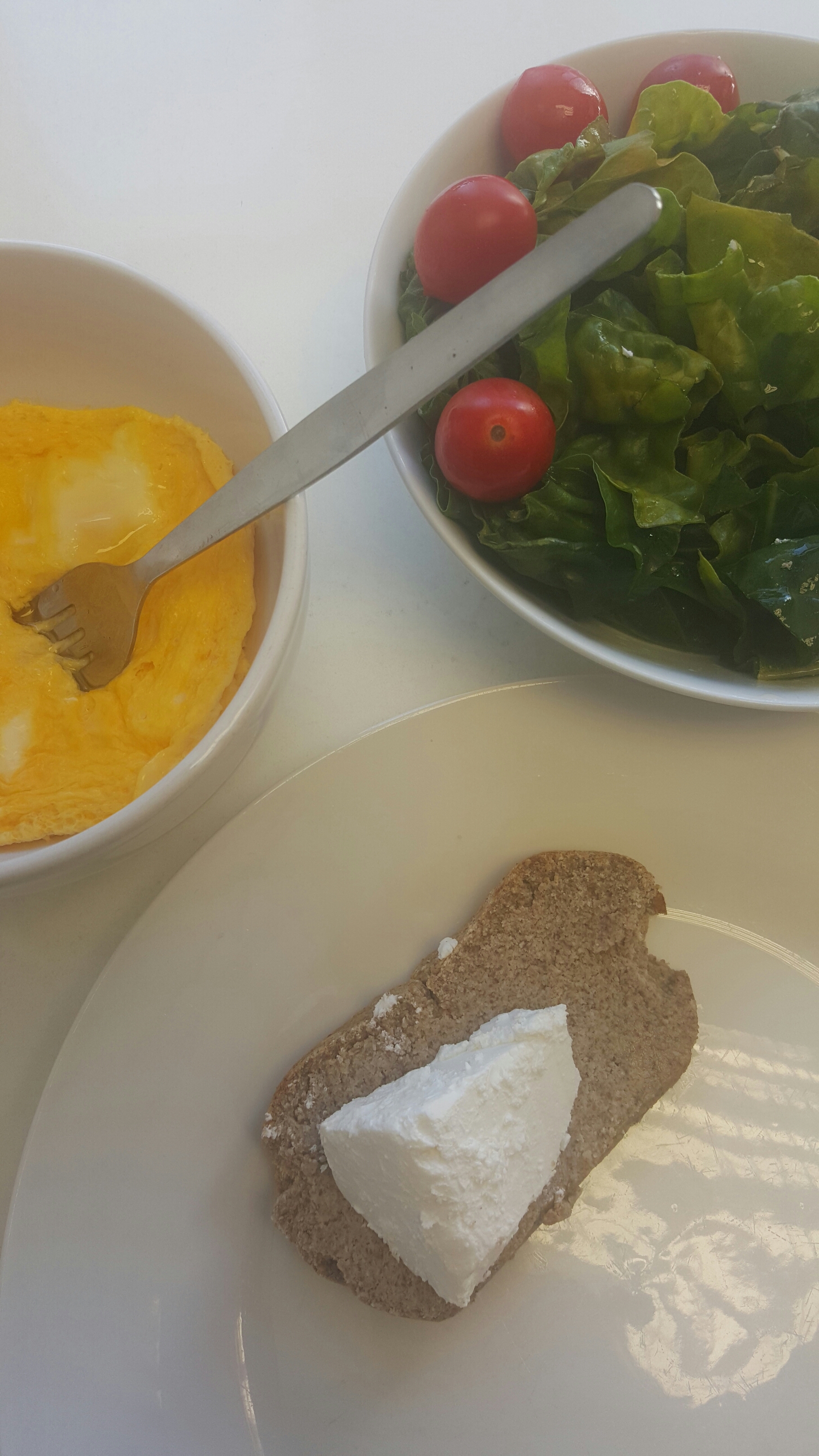 two eggs, salad with olive oil, banting bread and a cut of Feta.