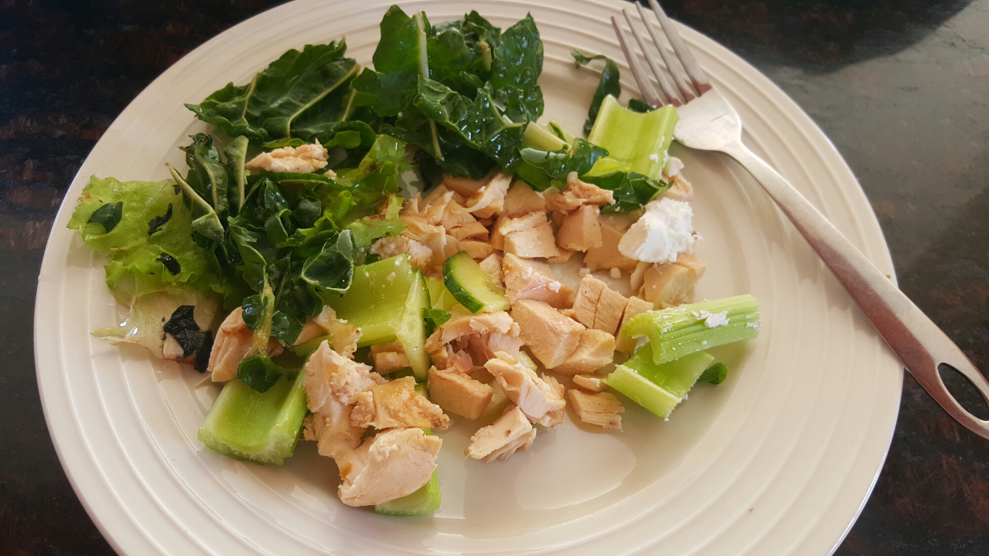 Feta, Chicken breast, spinach, lettuce, celery and ALOT of macadamia nut oil.