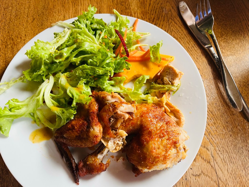 Breaking TMAD (Two meals a day). Roasted chicken, salad, cheese, dressing is macadamia oil, lemon juice and habanero sauce. And one cup of bulletproof coffee with collagen.